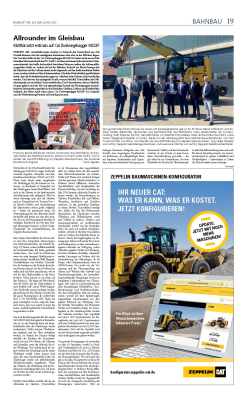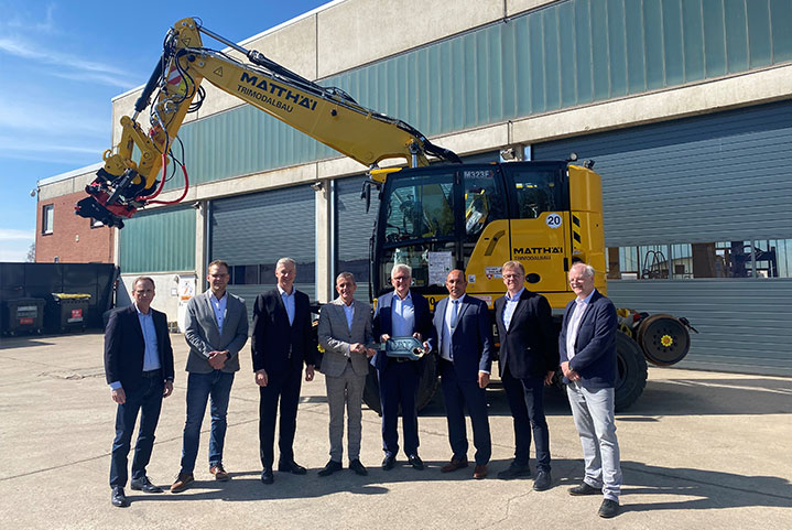 Mehr Effizienz und Nachhaltigkeit durch modernste Technik: Matthäi Trimodalbau hat die Maschinenflotte um den neuen ZW-Bagger CAT 323 F erweitert. Nach seiner Übergabe am 11. April 2022 wurde das neue Arbeitsgerät in den Dienst gestellt – mit einer feierlichen Schlüsselübergabe auf dem Betriebshof in Verden.
