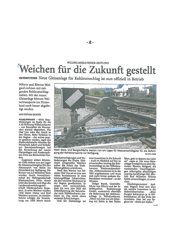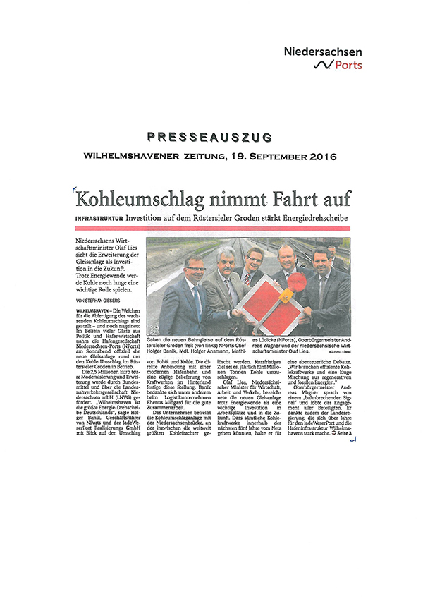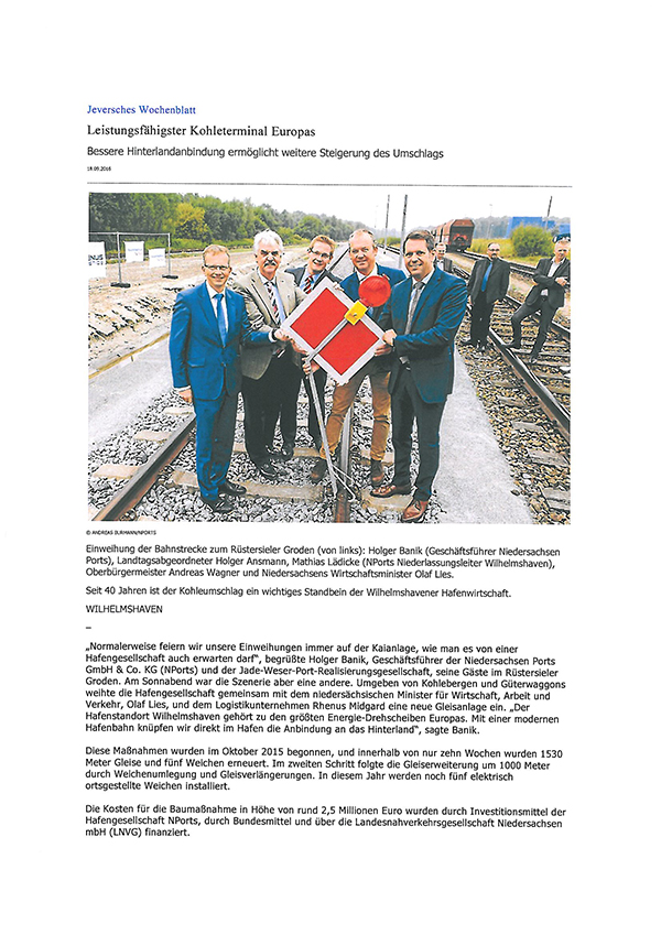 Zeitungsartikel aus der Wilhelmshavener Zeitung vom 19.09.2016.Die Bauarbeiten wurden von Matthäi Trimodalbau durchgeführt.