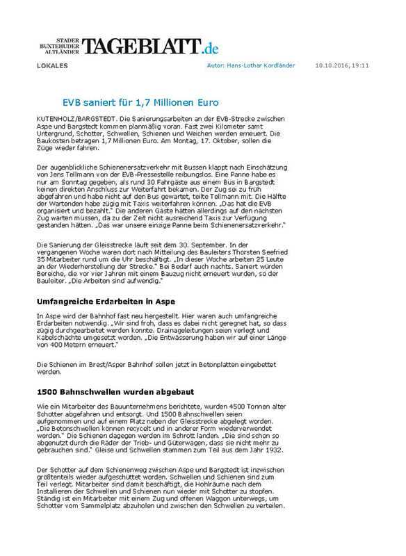 Zeitungsartikel aus dem Stader/Buxtehuder/Altländer Tageblatt vom 10.10.2016.